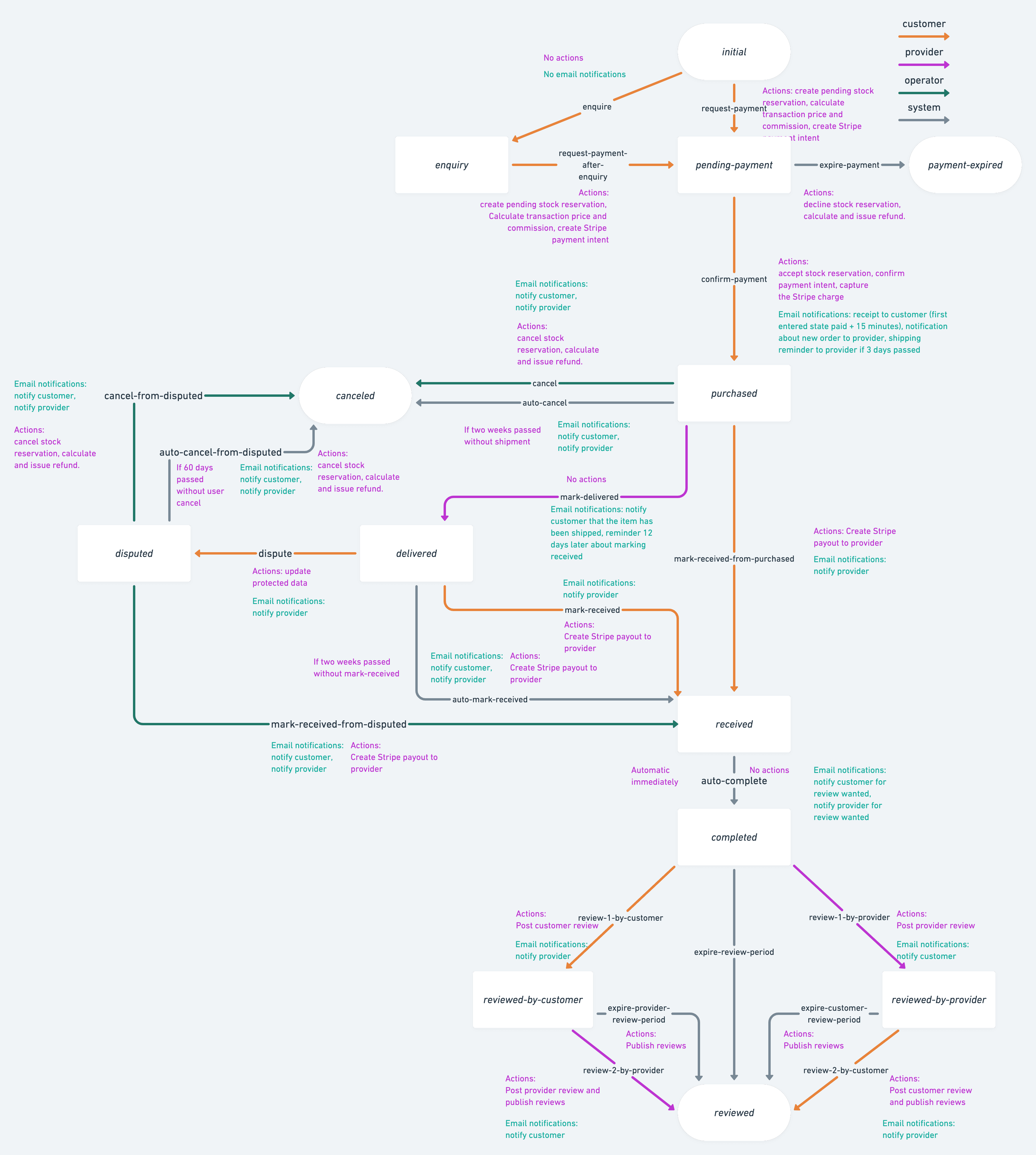 On TransactionPage (the page opened by clicking inbox items), the shipping address or pickup address is shown to both parties of the transaction. The provider has 2 weeks to mark the item shipped (transition/mark-delivered) or the automatic expiration happens (transition/auto-cancel) and the customer is refunded. If needed, the customer can dispute the order from the "Delivered" state.