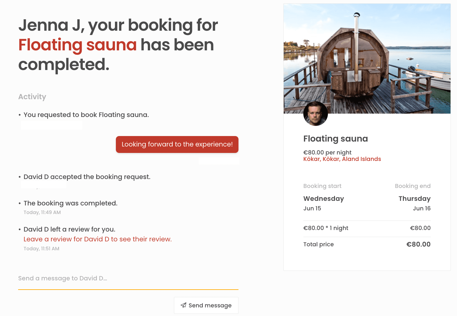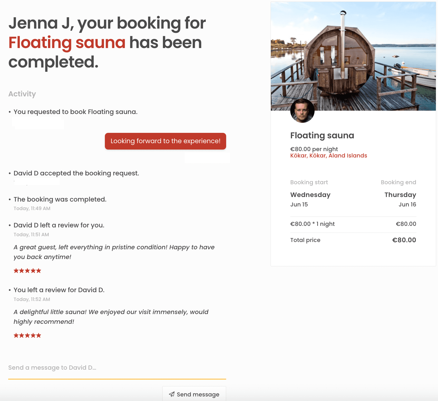 Saunatime allows providers and customers to send private messages related to listings and bookings. The messages are shown in a timeline that also shows the different actions the participants have taken in the transaction.
